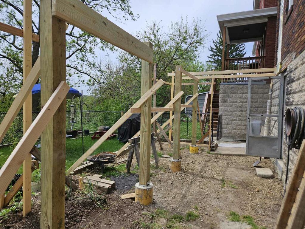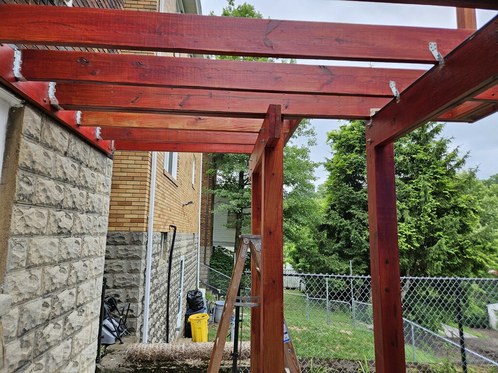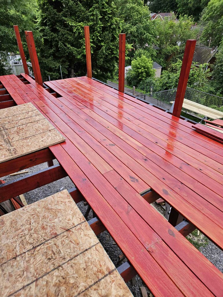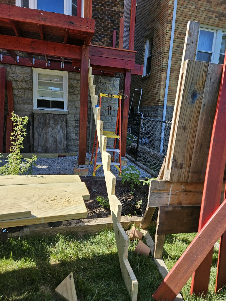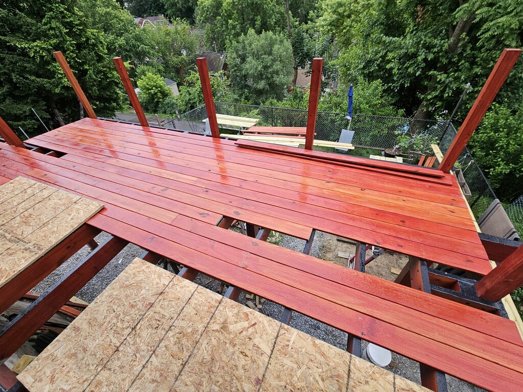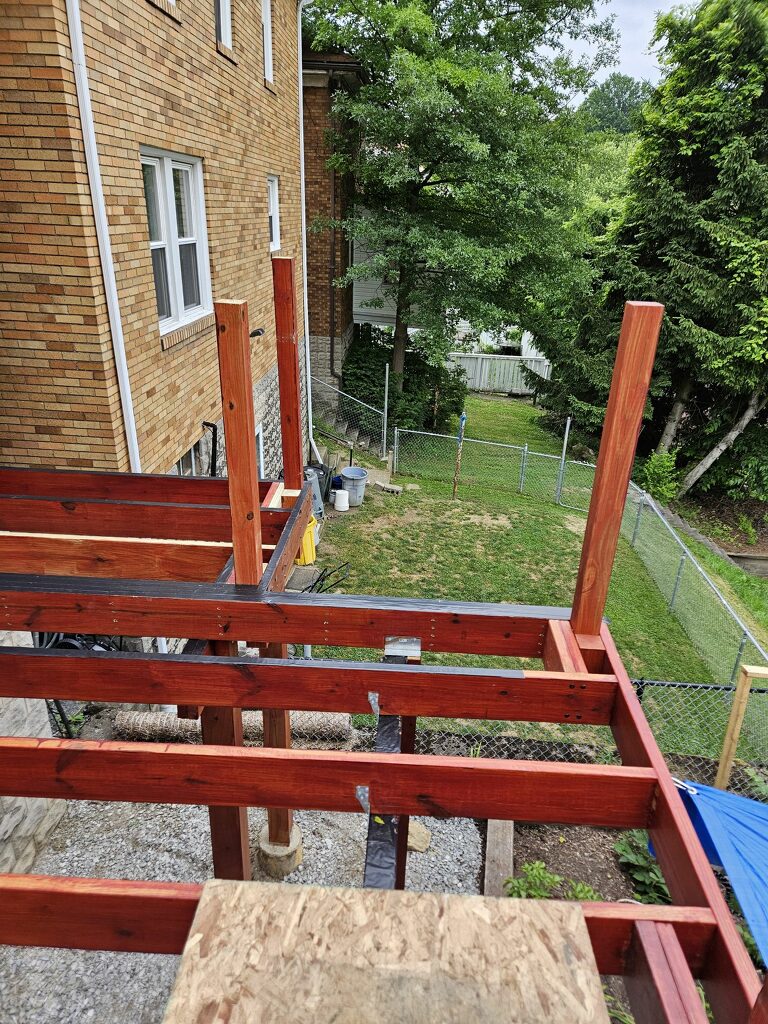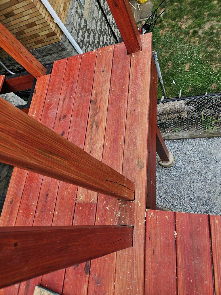 May 14 ledger board up solidly - bolts - wood stained - bit destruction