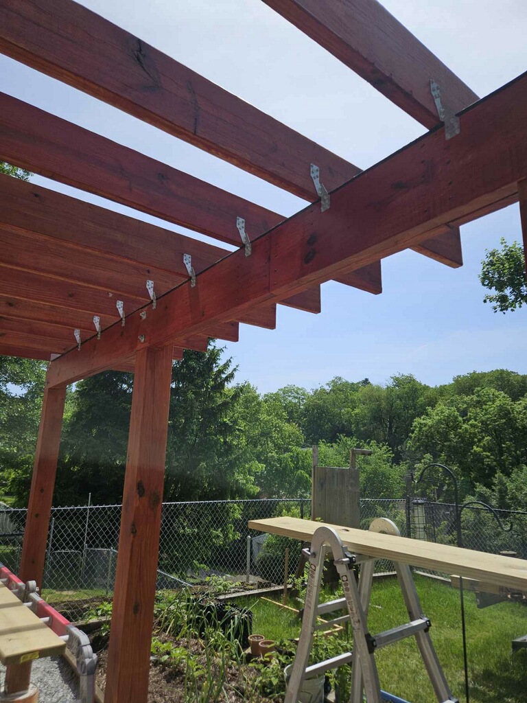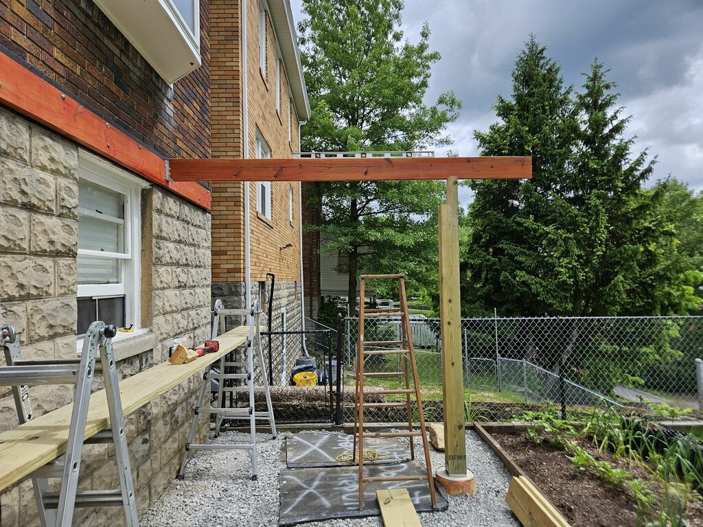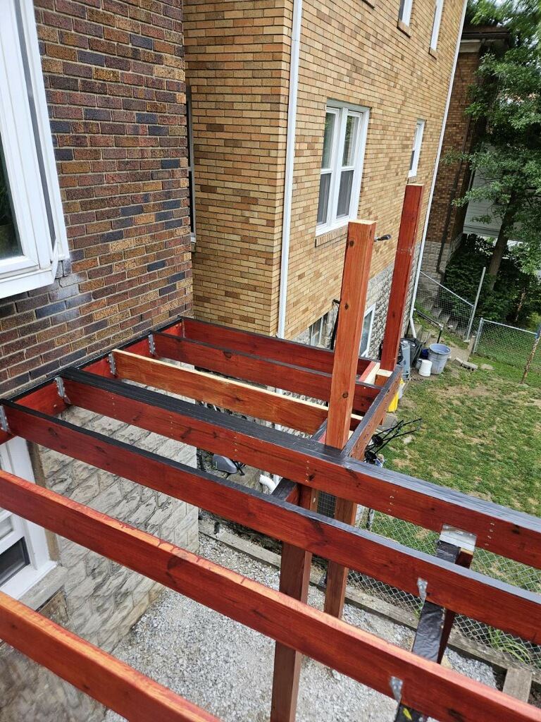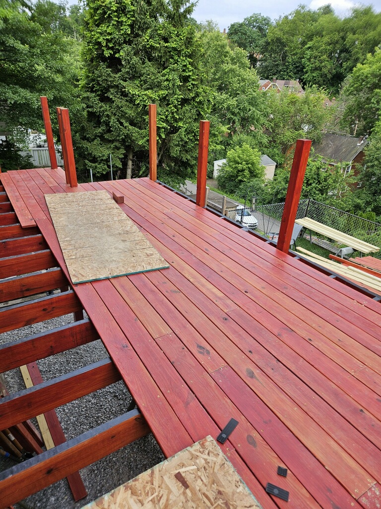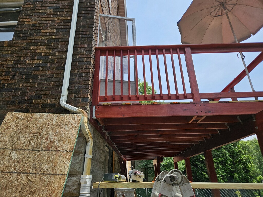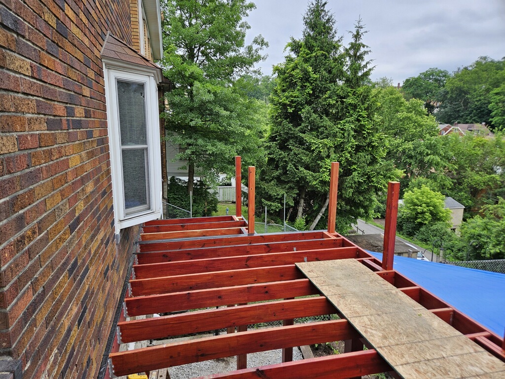 May 14 ledger board up solidly - bolts - wood stained - bit destruction