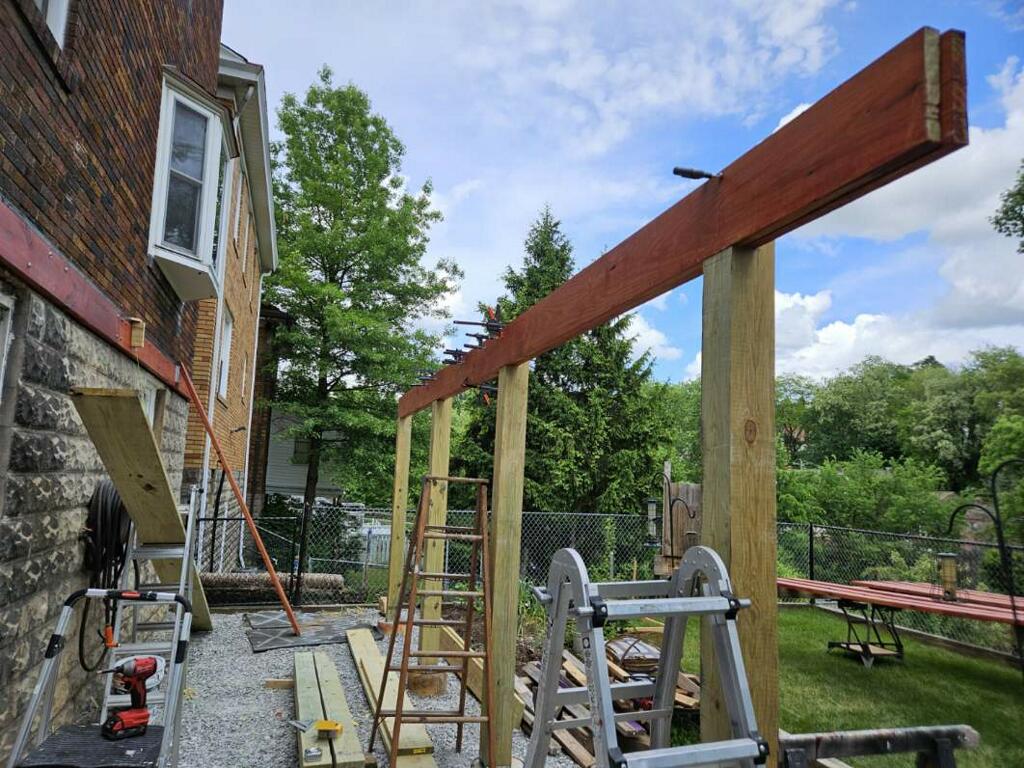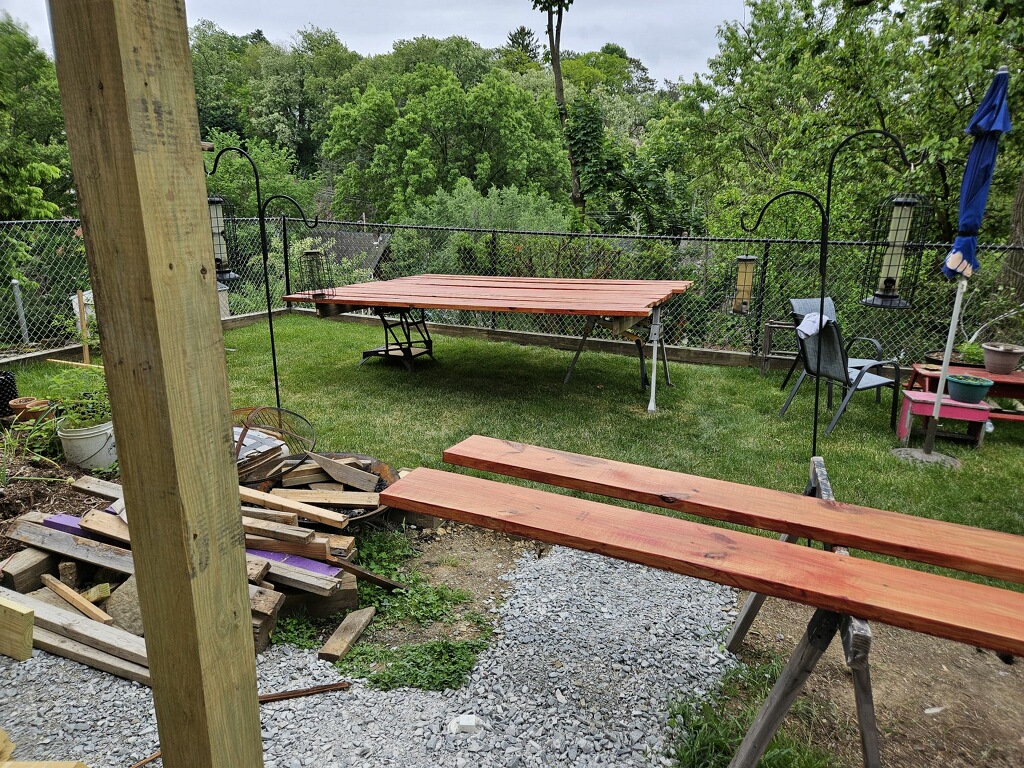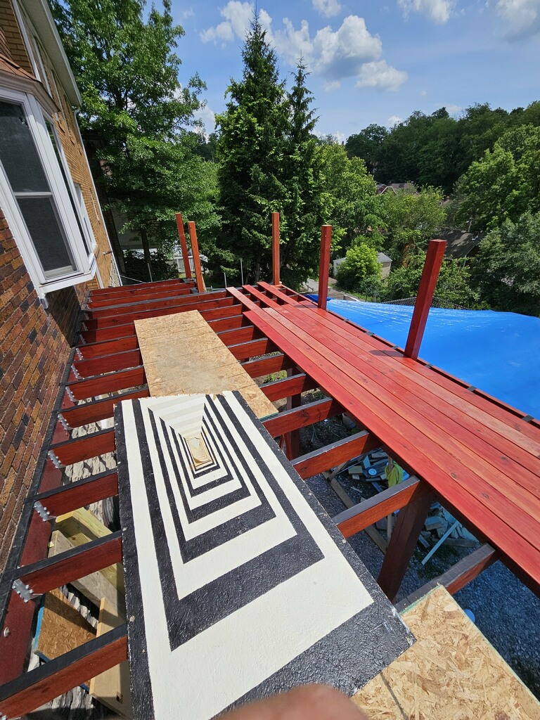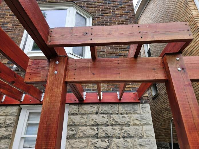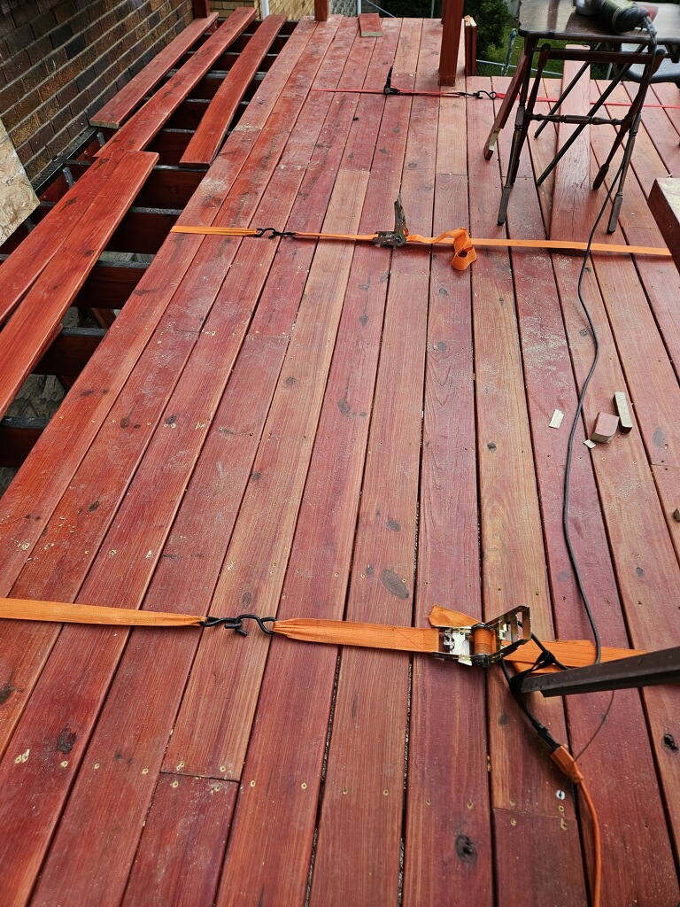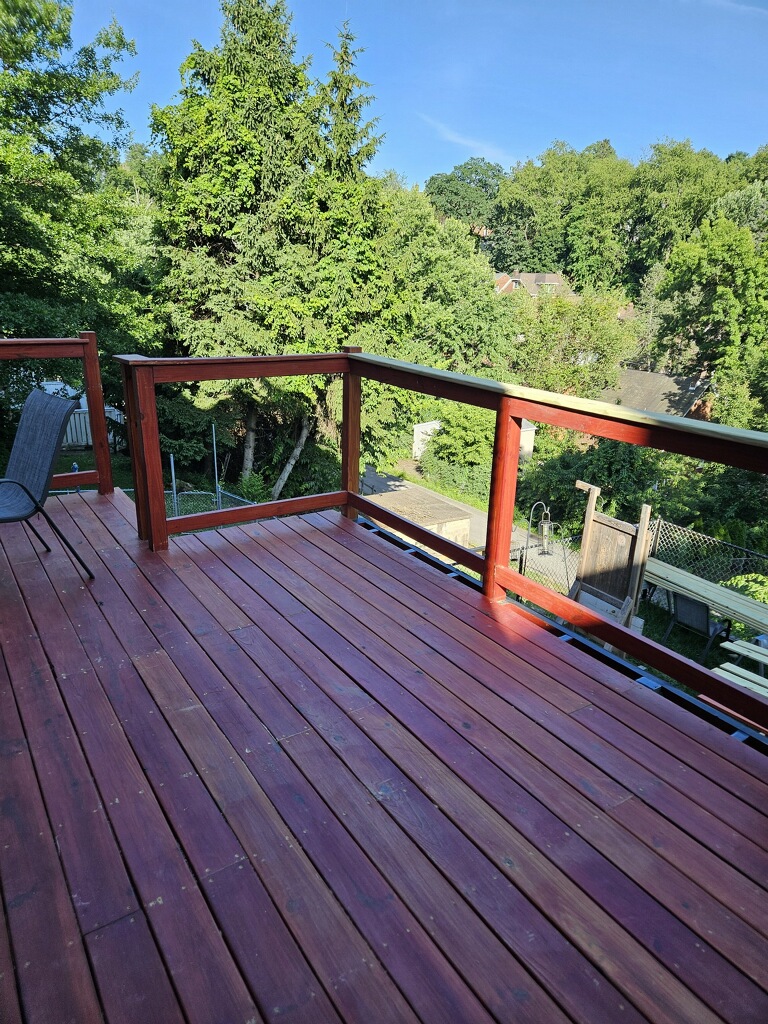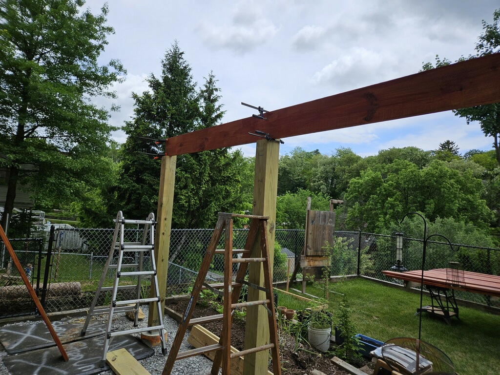 May 14 ledger board up solidly - bolts - wood stained - bit destruction