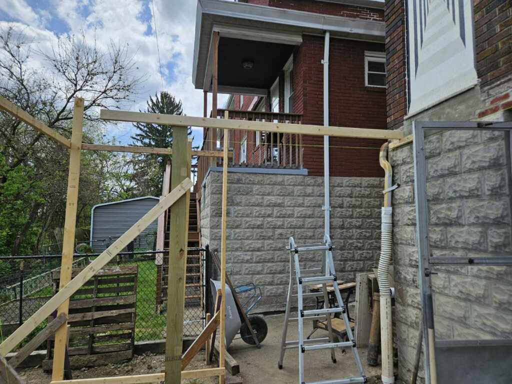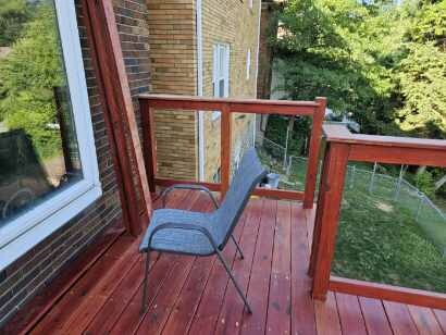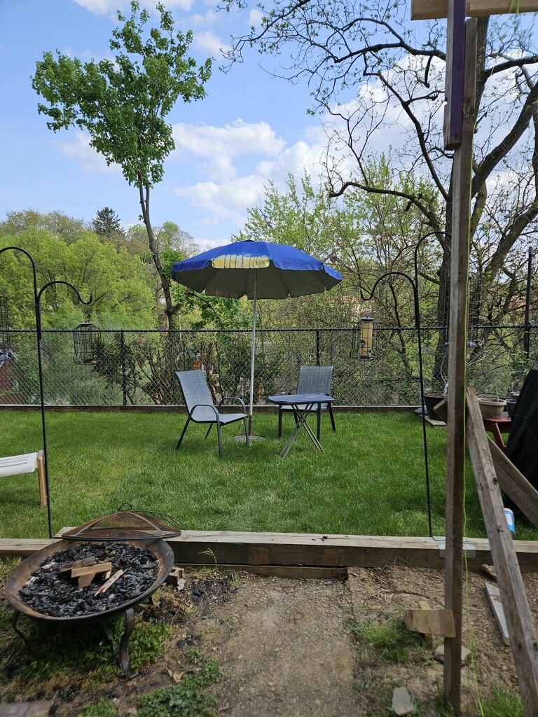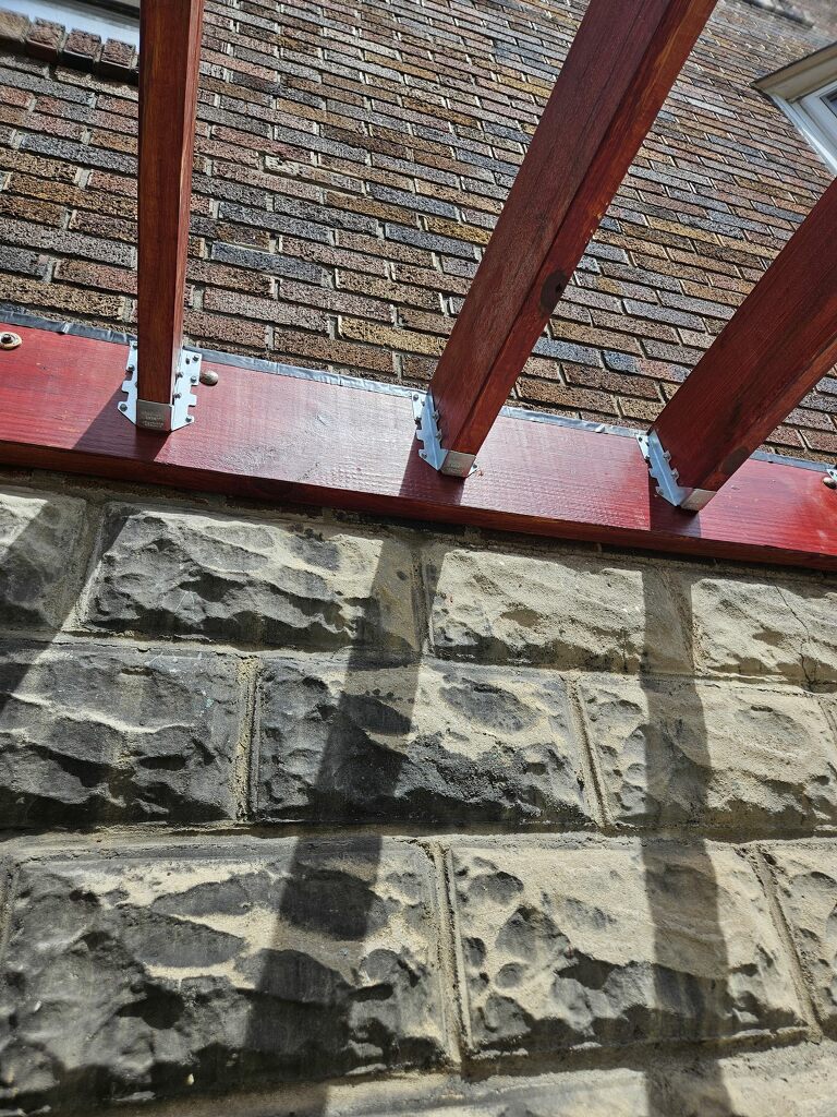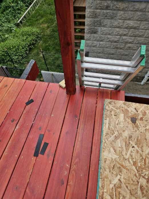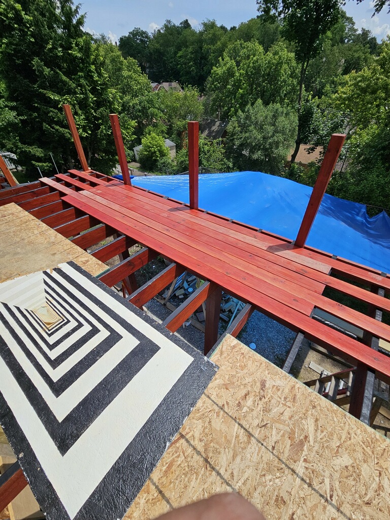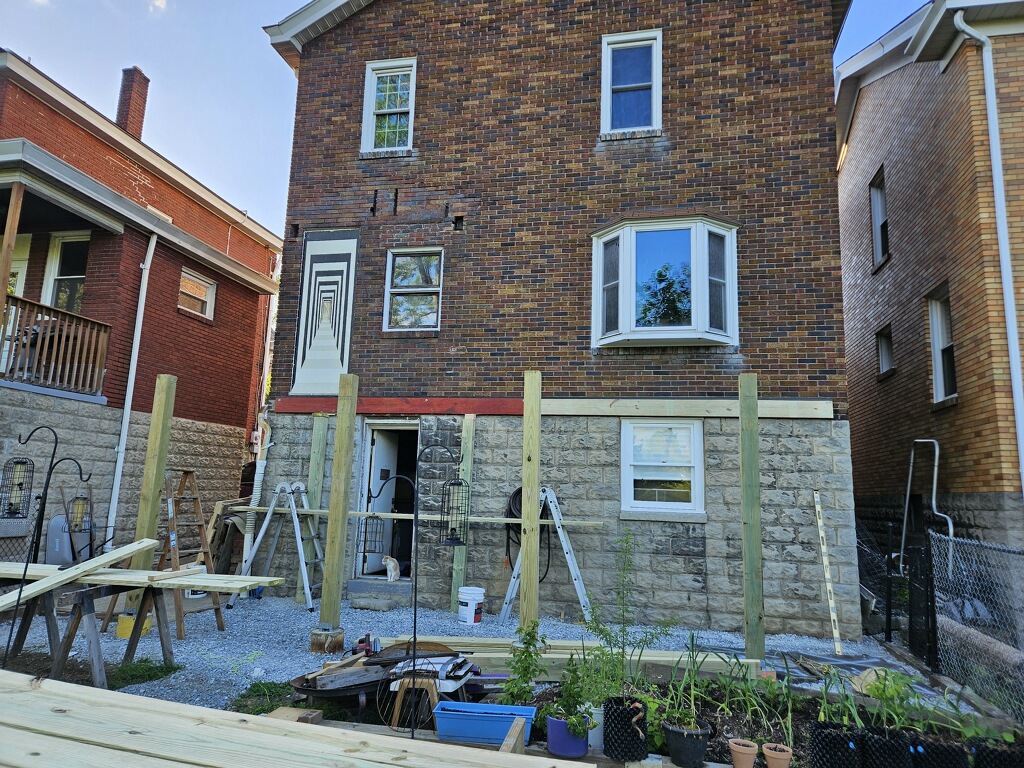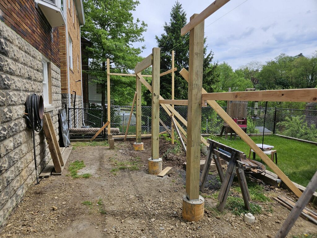 May 14 ledger board up solidly - bolts - wood stained - bit destruction