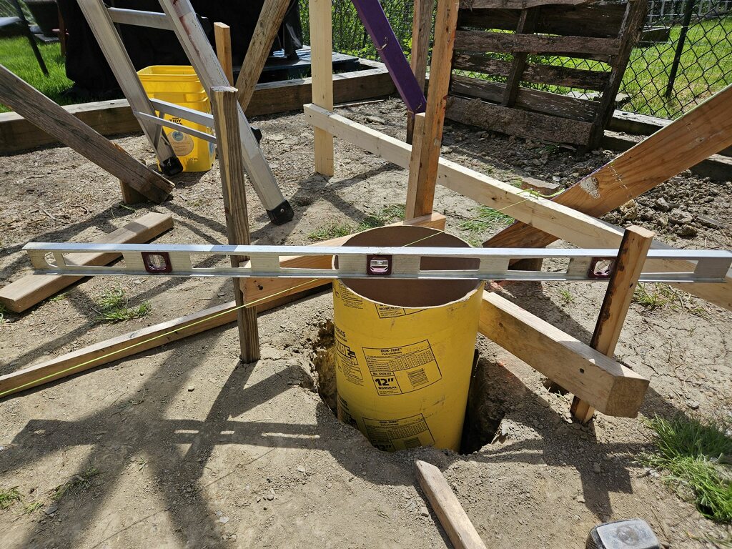 April 26 holes dug - measuring up and leveling - getting ready to pour